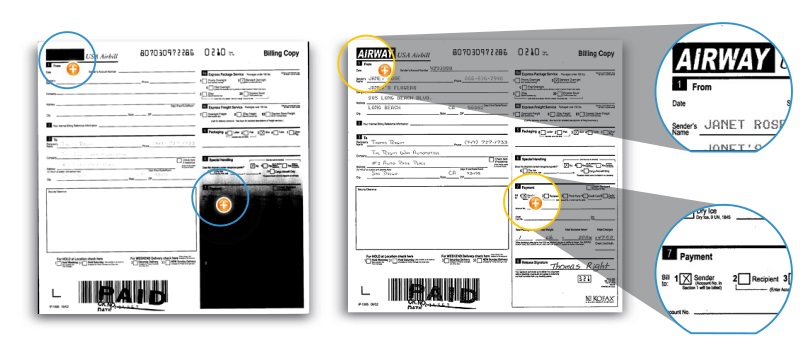 In cazul scanarii traditionale, notele facute cu creionul nu pot fi citite, iar textul incercuit este convertit in elemente intunecate si textul nu poate fi citit. In Kofax Express scrisul in creion este intunecat si aplicatia recunoaste iluminatoarele, elimina fundalul inutil. Datorita acestui fapt, textul scris cu creion sau incercuit in note de culori stralucitoare poate fi citit.